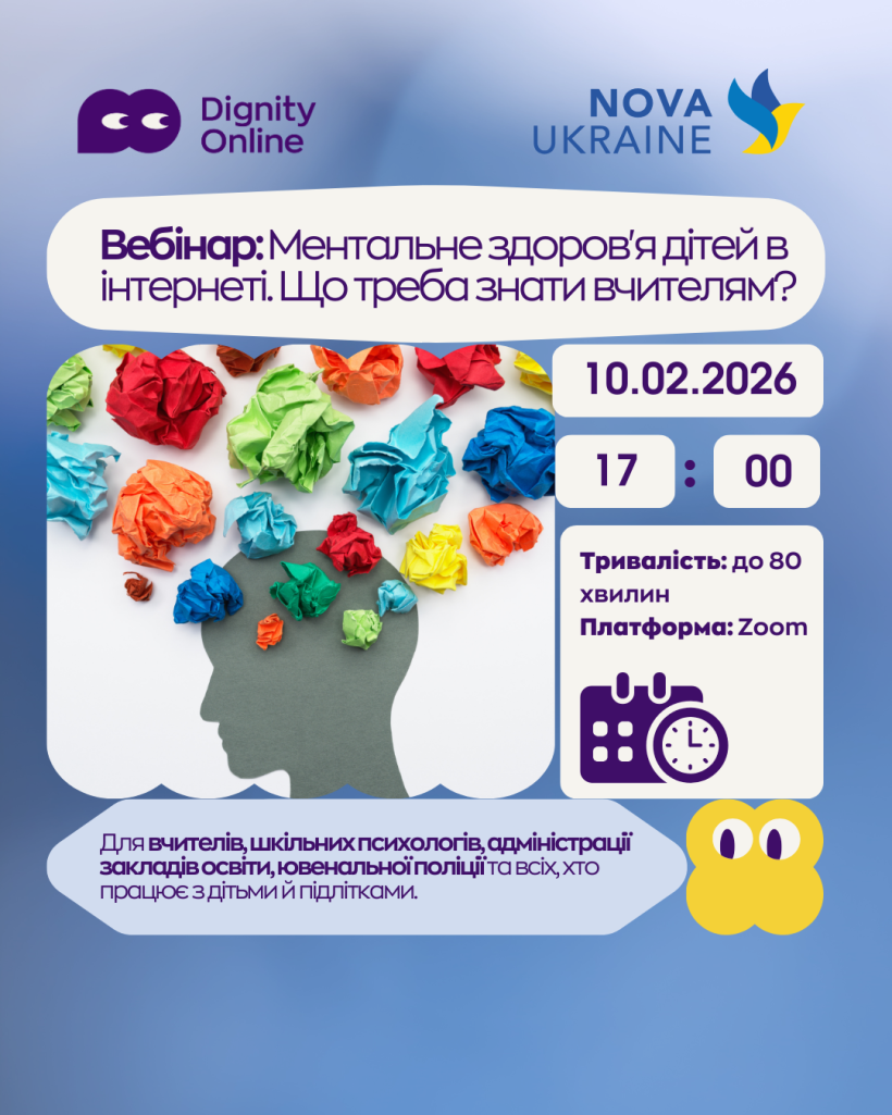 10 лютого о 17:00 відбудеться безкоштовний вебінар для освітян, під час якого тренер ГО Dignity Online розкриє тему впливу цифрового середовища на ментальне здоров’я дітей, презентує готові уроки для учнів 2–11 класів та надасть практичні рекомендації для їх впровадження в освітньому процесі. Педагогічні працівники, які візьмуть участь у вебінарі та проведуть урок після нього, матимуть можливість отримати сертифікат про підвищення кваліфікації. Деталі будуть озвучені під час заходу. Проєкт реалізовано за підтримки міжнародного благодійного фонду Nova Ukraine.